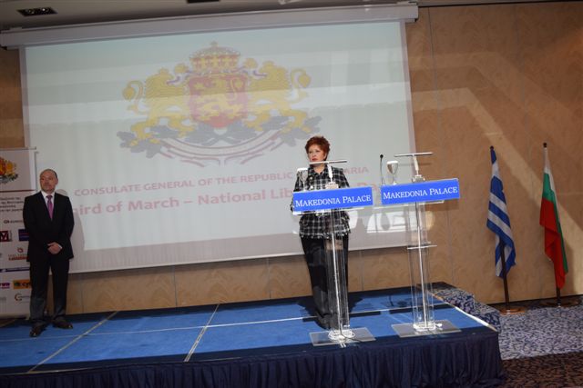 Η Υφυπουργός Εσωτερικών και Διοικητικής Ανασυγκρότησης (Μακεδονίας-Θράκης), Μαρία Κόλλια-Τσαρουχά, απηύθυνε χαιρετισμό στην εκδήλωση για την Εθνική Επέτειο της Βουλγαρίας που έγινε το βράδυ της Τρίτης 3 Μαρτίου του 2015, στην αίθουσα Αριστοτέλης του Μακεδονίας Παλλάς, παρουσία του Βούλγαρου Πρέσβη κ. Vassil Valchev και της Προξένου και Υφυπουργού Άμυνας της Βουλγαρίας κυρίας Desilava Yosifina.