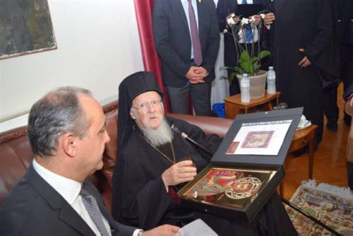 “Αντλούμε δύναμη από τον Οικουμενικό Θρόνο, από το παράδειγμά του, καθώς και από τους αγώνες που δίνει καθημερινά εν μέσω αντιξοοτήτων” πρόσθεσε ο κ. Καράογλου, ο οποίος χάρισε στον Οικουμενικό Πατριάρχη μια εικόνα του Αγίου Βαρθολομαίου.
