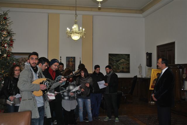 Πρώτοι τα έψαλαν στον Υπουργό Μακεδονίας και Θράκης τα μέλη του συλλόγου Λεχριτών κανταδόρων και ακολούθησαν η φιλαρμονική μπάντα της Αστυνομίας, η χορωδία του συλλόγου «Αριστοτέλης», η μπάντα του Δήμου Λαγκαδά, η χορωδία του Λυκείου Ελληνίδων, η φιλαρμονική του Δήμου Θεσσαλονίκης και η μπάντα του Γ’ Σώματος Στρατού. Το Διοικητήριο επισκέφθηκαν ακόμη αντιπροσωπείες της ΚΝΕ Θεσσαλονίκης και καθηγητών των ΕΠΑΛ που τέθηκαν σε διαθεσιμότητα, οι οποίες έψαλαν στον κ. Καράογλου τα δικά τους κάλαντα