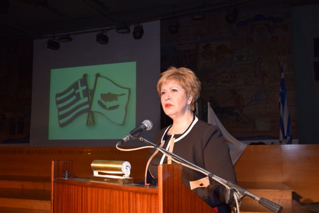 Παρουσία του Υπουργού Εσωτερικών της Κυπριακής Δημοκρατίας, Σωκράτη Χάσικου, η Μαρία Κόλλια Τσαρουχά έκανε τον ακόλουθο χαιρετισμό: