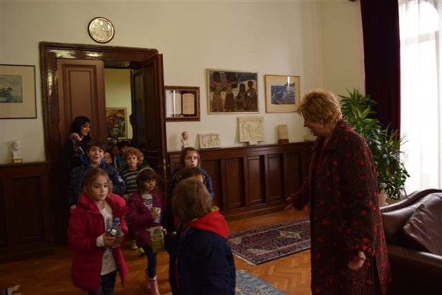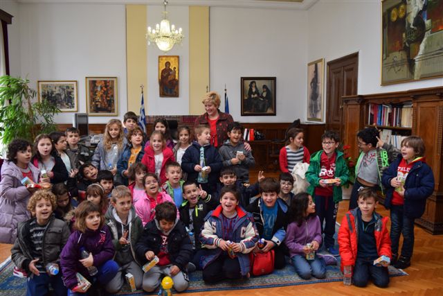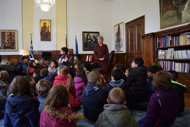 Μια ευχάριστη έκπληξη περίμενε χθες, Παρασκευή 27 Νοεμβρίου 2015, την Υφυπουργό Εσωτερικών και Διοικητικής Ανασυγκρότησης (Μακεδονίας-Θράκης), κα Μαρία Κόλλια-Τσαρουχά. Μαθητές της β’ τάξης του 55ου Δημοτικού Σχολείου Θεσσαλονίκης, συνοδεία δύο εκπαιδευτικών, επισκέφθηκαν το Διοικητήριο και ξεναγήθηκαν στο ιστορικό κτίριο, ενώ έγιναν δεκτοί και από την Υφυπουργό, κα Μαρία Κόλλια-Τσαρουχά, η οποία κάνοντας ένα μικρό διάλειμμα από το πρόγραμμά της, τούς καλωσόρισε στο γραφείο της.