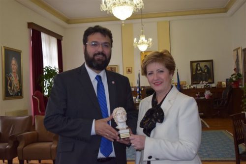 Η Υφυπουργός Εσωτερικών (Μακεδονίας-Θράκης) κα Μαρία Κόλλια-Τσαρουχά υποδέχτηκε σήμερα, Παρασκευή 31 Μαρτίου 2017, στο γραφείο της στο Διοικητήριο, τον Υφυπουργό Πολιτισμού και Αθλητισμού, αρμόδιο για τον Αθλητισμό, κ. Γιώργο Βασιλειάδη. Κατά τη διάρκεια της συνάντησης συζητήθηκαν θέματα Αθλητισμού στην ευρύτερη περιοχή της Μακεδονίας και της Θράκης, όπως και η προώθηση ενός πλαισίου δράσεων που θα υποδείξουν περαιτέρω την άθληση ως τρόπο ζωής για όλο το φάσμα των ηλικιών.