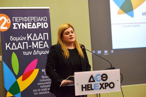 Ομιλία – χαιρετισμό στο 2ο “Περιφερειακό Συνέδριο δομών Κέντρων Δημιουργικής Απασχόλησης Παιδιών (ΚΔΑΠ) και παιδιών-ατόμων με αναπηρίες (ΚΔΑΠ-ΜΕΑ) των Δήμων “, απηύθυνε σήμερα το πρωί η Υφυπουργός Εσωτερικών, Τομέας Μακεδονίας – Θράκης, Ελευθερία Χατζηγεωργίου. Οι εργασίες του Συνεδρίου διεξήχθησαν στο Συνεδριακό Κέντρο Νικόλαος Γερμανός, στη ΔΕΘ – HELEXPO (Αίθουσα Α, Περίπτερο 8).
