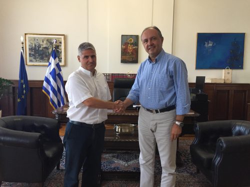 Οι τρόποι τόνωσης της τουριστικής κίνησης της Θεσσαλονίκης, η περαιτέρω προβολή της πόλης με σκοπό τη μεγαλύτερη αναγνωρισιμότητα της και οι επενδυτικές δυνατότητες στην ξενοδοχειακή αγορά της ήταν τα βασικά θέματα της συνάντησης που είχε σήμερα στο Διοικητήριο ο Υφυπουργός Εσωτερικών (Μακεδονίας και Θράκης), κ. Θεόδωρος Καράογλου, με τον Πρόεδρο της Ένωσης Ξενοδόχων Θεσσαλονίκης κ. Ανδρέα Μανδρίνο.
