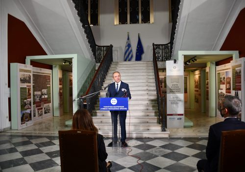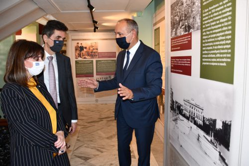 Στον ειδικά διαμορφωμένο εκθεσιακό χώρο και τηρώντας αυστηρά όλα τα υγειονομικά πρωτόκολλα, ο κ. Καράογλου παρουσίασε στην Πρόεδρο της Δημοκρατίας σπάνιο φωτογραφικό και αρχειακό υλικό από στιγμές που αποτέλεσαν ορόσημο στην ιστορία του κτηρίου και οι οποίες αντικατοπτρίζουν σημαντικά γεγονότα της νεότερης πολιτικής ιστορίας της πατρίδας μας.
